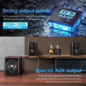 Strong output power and special AUX output: use TI’s classic power amp IC, each channel can output 100W(4Ω) and easily to drive all 3-8Ω passive speakers, adds 3.5mm AUX output easy to connect another amplifier or active speaker / subwoofer to build multiple channel system and enjoy wonderful home theater experience.